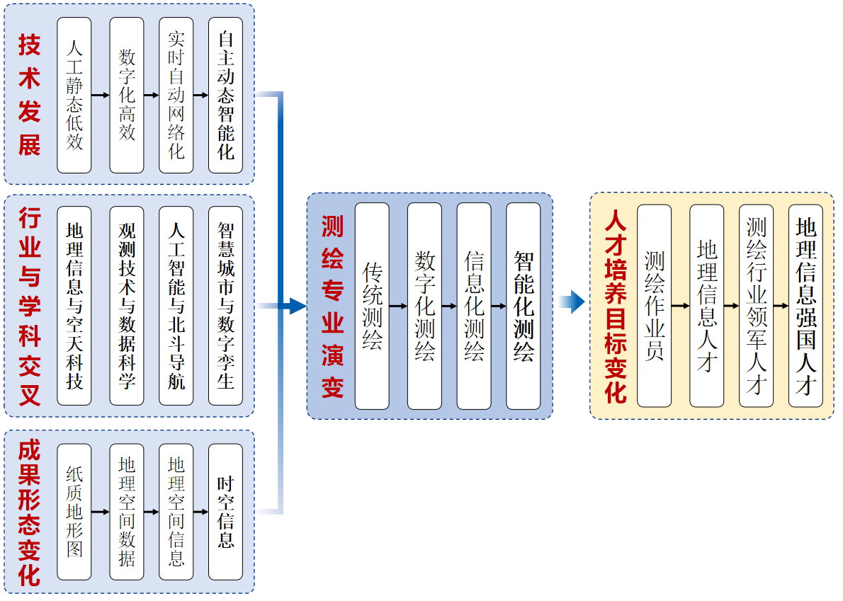 原有面向工程以“数据获取、数据处理”为核心的人才培养模式,已不适应当前面向大众、以“时空信息服务”为核心的智能化测绘需求,以科技强国精神为内驱力、以地理信息强国人才培养为目标,探索智能化测绘人才培养新模式势在必行。