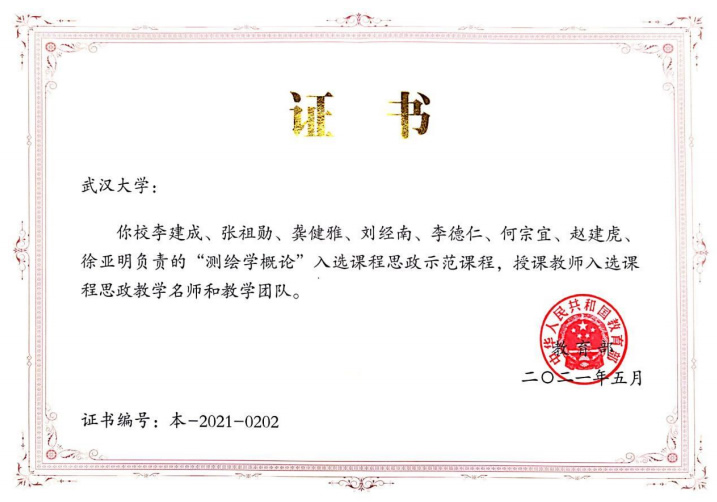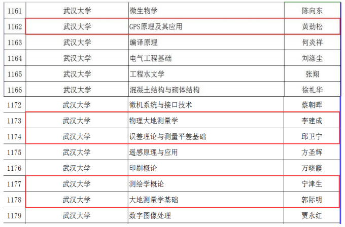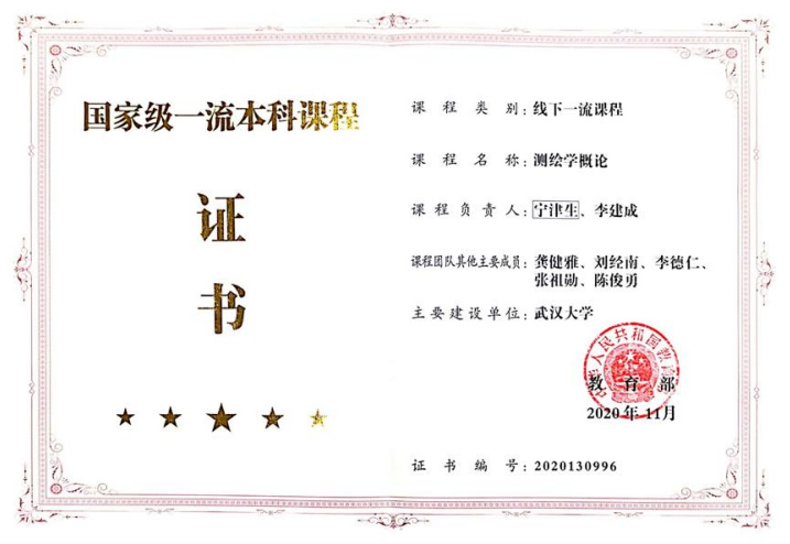 | 1. | 测绘学概论 | 线下一流课程 | 国家级 | 宁津生 李建成 龚健雅 刘经南 李德仁 张祖勋 陈俊勇 |