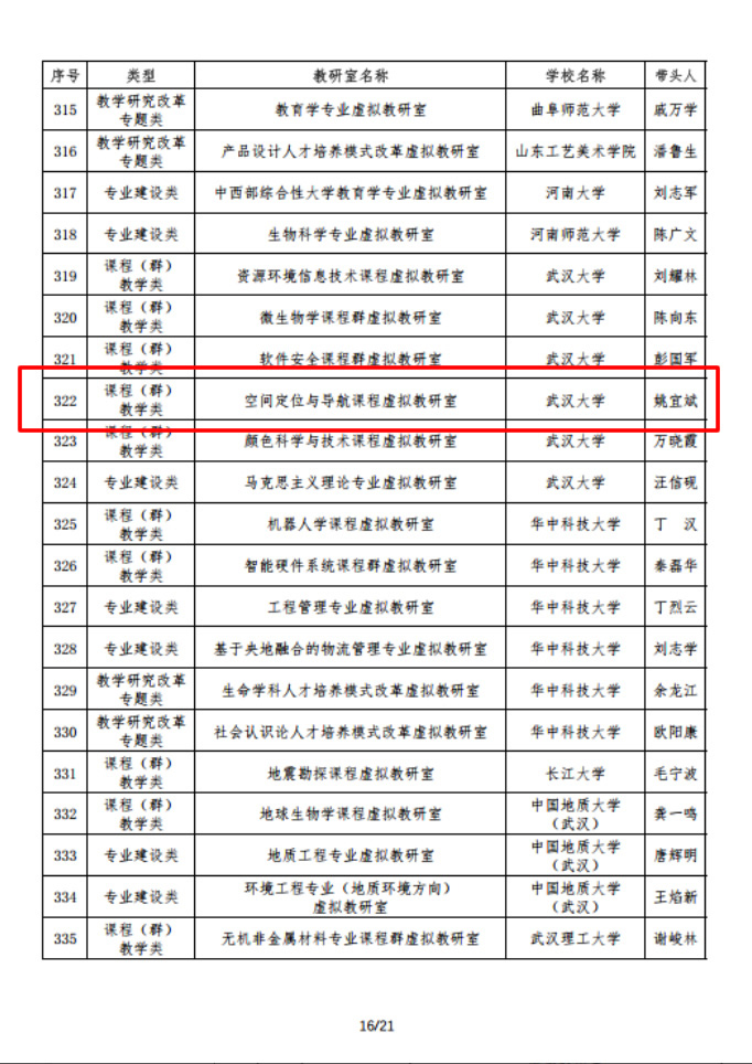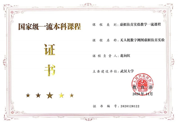 | 2. | 无人机数字测图虚拟仿真实验 | 虚拟仿真实验教学一流课程 | 国家级 | 花向红 邹进贵等 | 2020 |