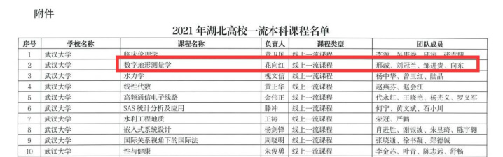 | 3. | 数字地形测量学 | 线上一流课程 | 省级 | 花向红 邹进贵等 | 2021 |