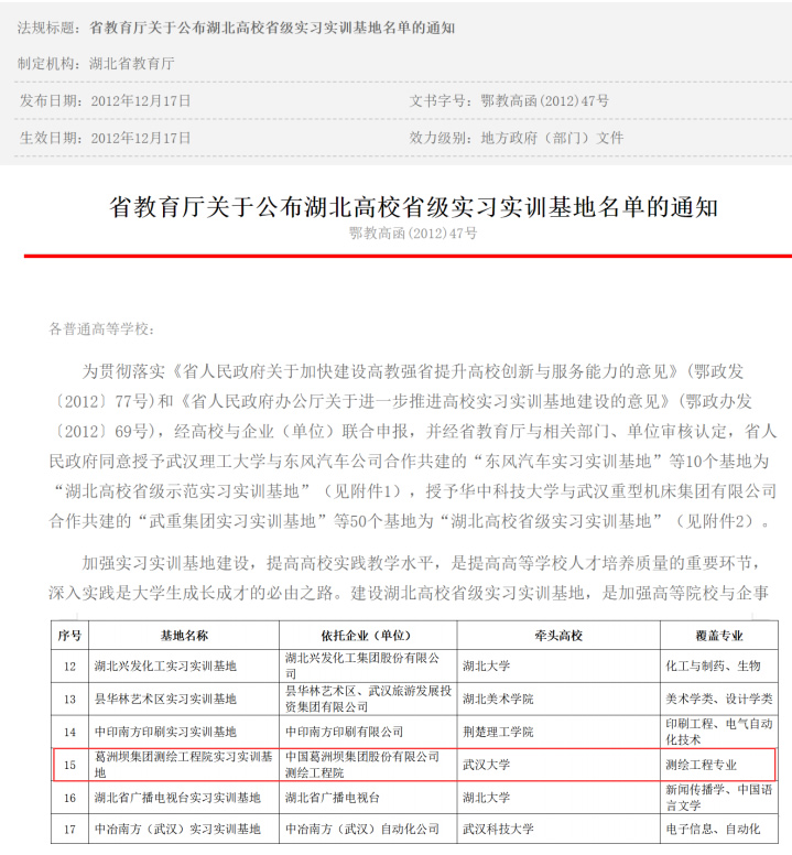 | 2 | 省级 | 葛洲坝集团测绘工程院实习实训基地 | 2012.12.17 |