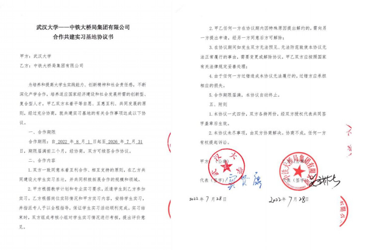 | 4 | 校级 | 武汉大学-中铁大桥局集团有限公司合作共建实习基地 | 2022.7.28 |