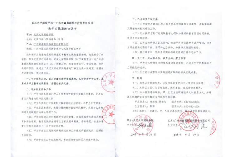 | 15 | 院级 | 武汉大学测绘学院-广东邦鑫勘测科技股份有限公司教学实践基地 | 2018.04.24 |
