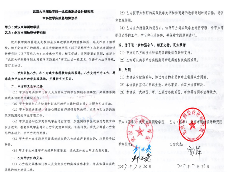 | 18 | 院级 | 武汉大学测绘学院-北京市测绘设计研究院本科教学实践基地 | 2017.07.20 |
