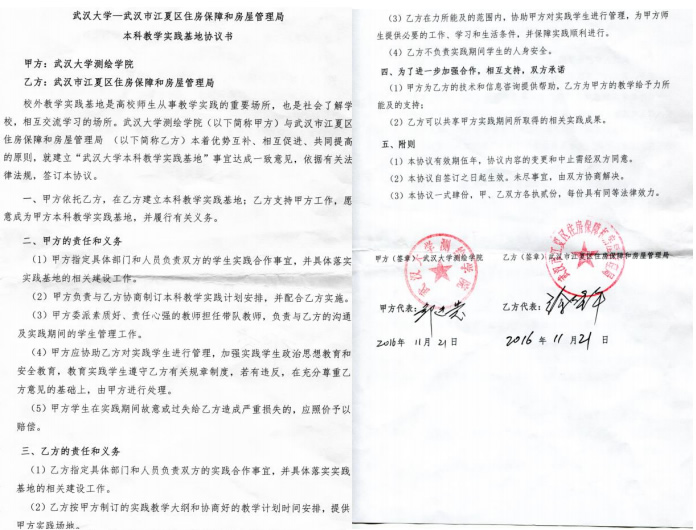 | 20 | 院级 | 武汉大学-武汉市江夏区住房保障和房屋管理局本科教学实践基地 | 2016.11.21 |