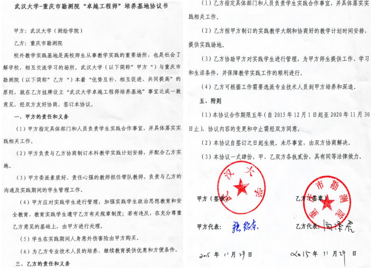 | 10 | 校级 | 武汉大学-重庆市勘测院“卓越工程师”培养基地 | 2015.11.29 |