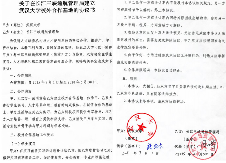 | 12 | 校级 | 武汉大学-长江三峡通航管理局合作共建武汉大学校外合作基地 | 2015.07.01 |