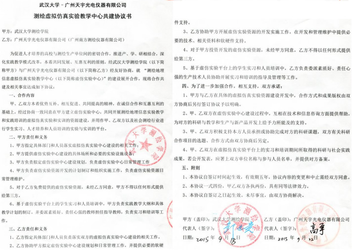 | 23 | 院级 | 武汉大学-广州天宇光电仪器有限公司测绘虚拟仿真实验教学中心 | 2015.09.22 |