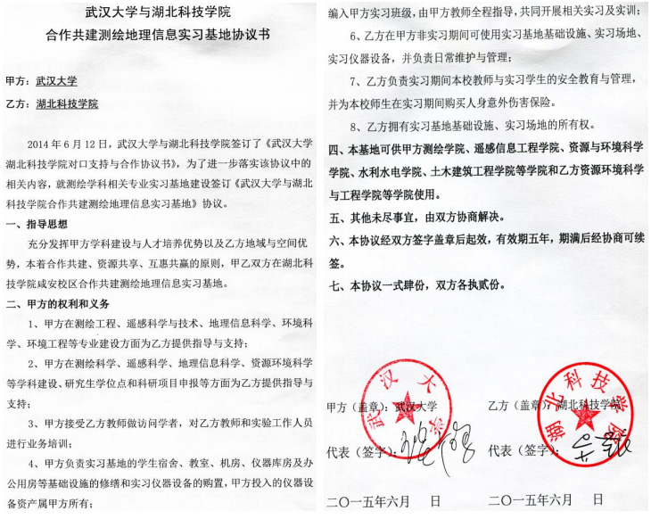 | 11 | 校级 | 武汉大学与湖北科技学院合作共建测绘地理信息实习基地 | 2015.06.15 |