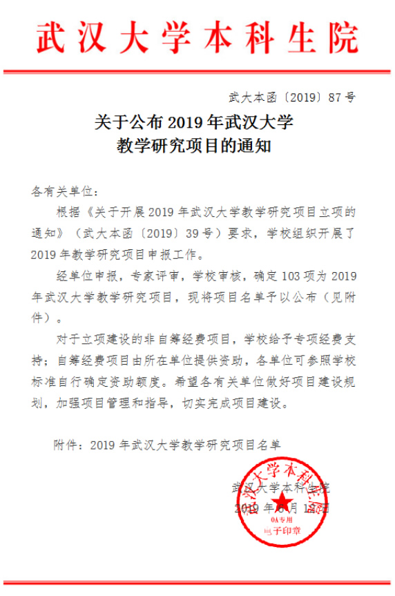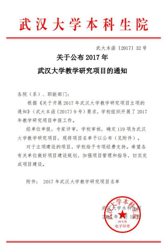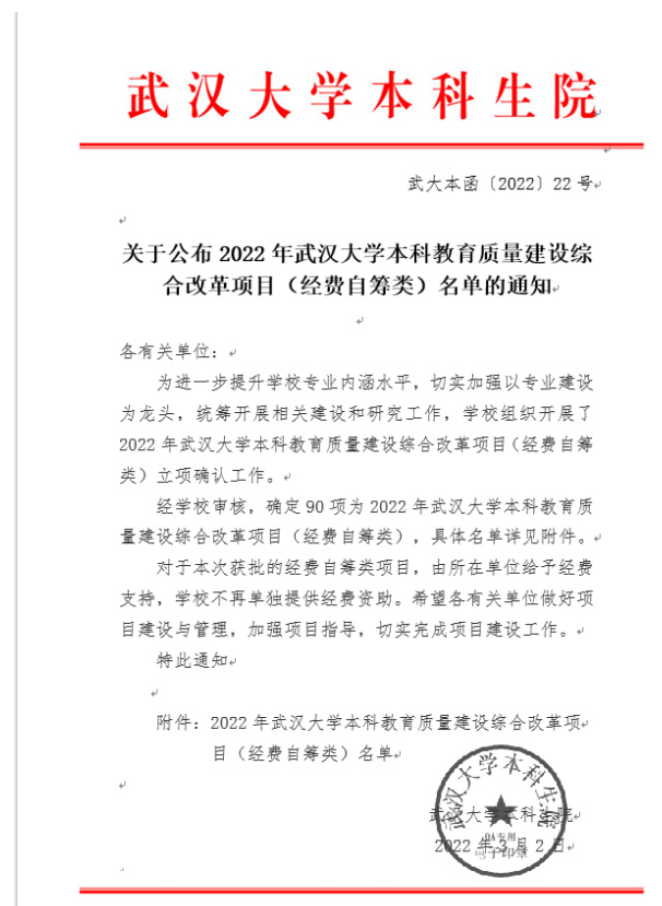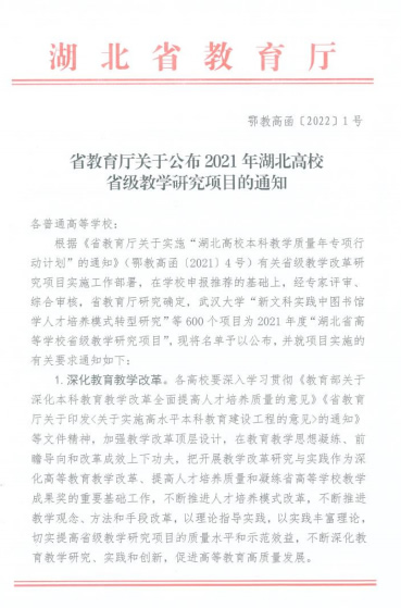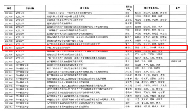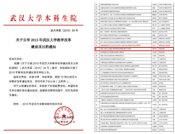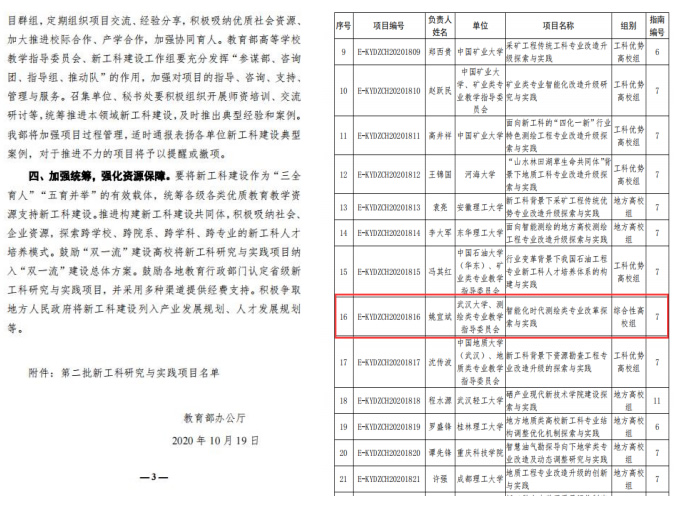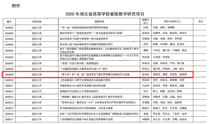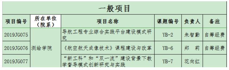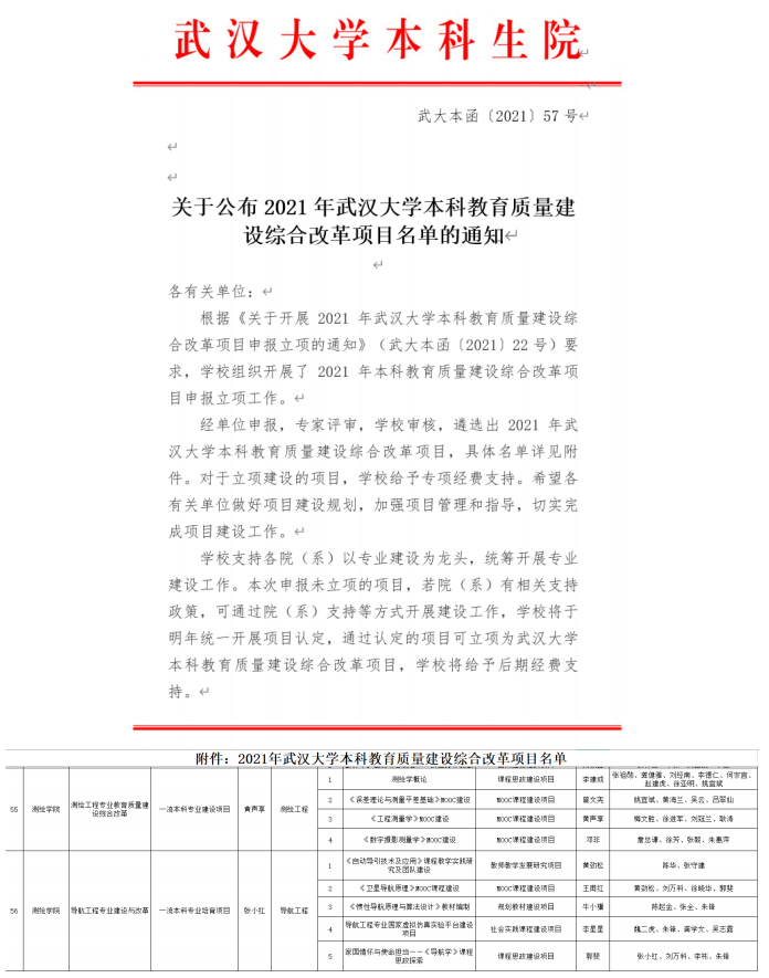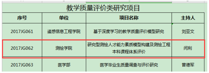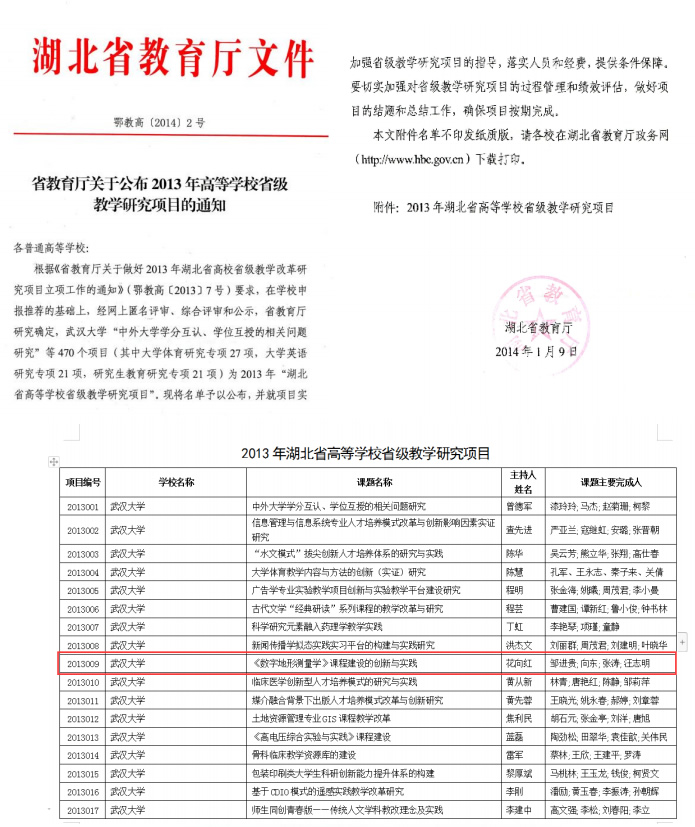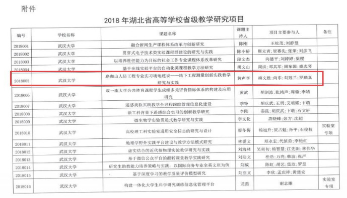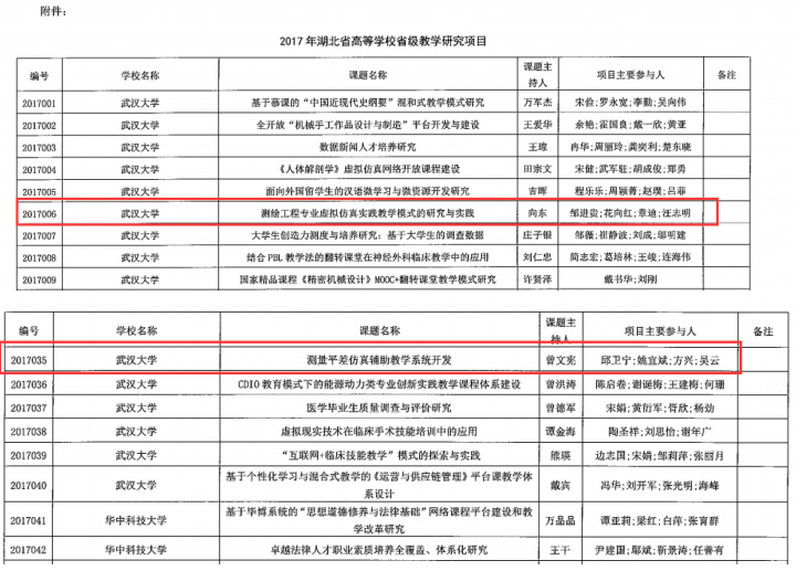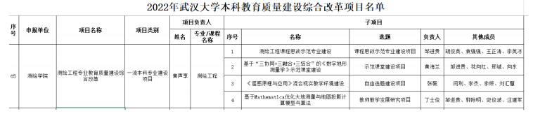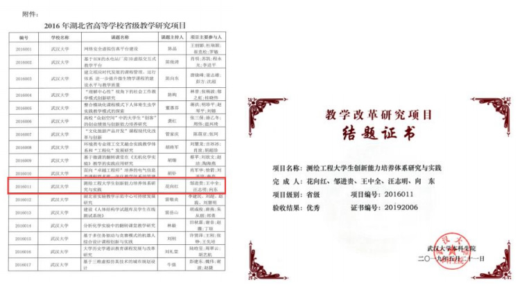 | 1. | 新工科研究与实践项目“智能化时代测绘类专业改革探索与实践” | 姚宜斌 许才军 闫 利 邹进贵 张小红 黄声享 申文斌 向 东 王甫红 罗 佳 詹总谦 李英冰 邢 诚 李星星 冯绍军 戴 震 蔚保国 宋健宇 褚丽丽 |
