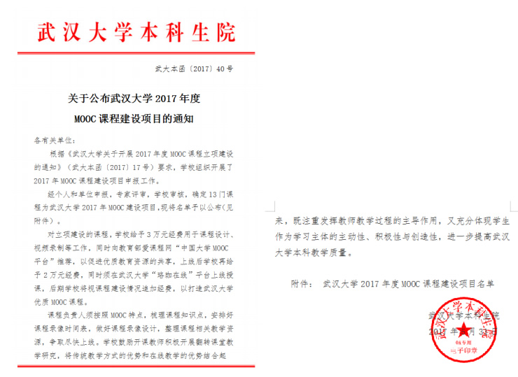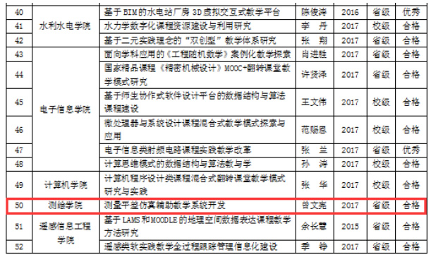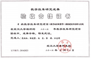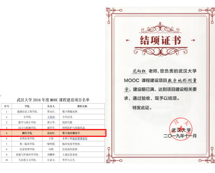 | 39. | 《数字地形测量学》MOOC 课程建设 | 花向红 邹进贵等 | 2016 | 校级 |