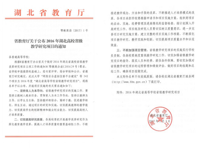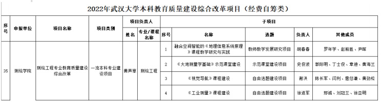 | 4. | 高等学校本科教学质量与教学改革工程建设项目-- 《专业综合改革试点-测绘工程专业》 | 许才军 黄声享等 | 2012 | 国家级 |