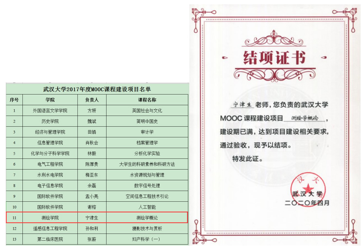 | 38. | 《测绘学概论》MOOC 课程建设 | 宁津生 陈俊勇 张祖勋 刘经南 李德仁 龚健雅 姚宜斌 徐亚明 何宗宜 赵建虎 |