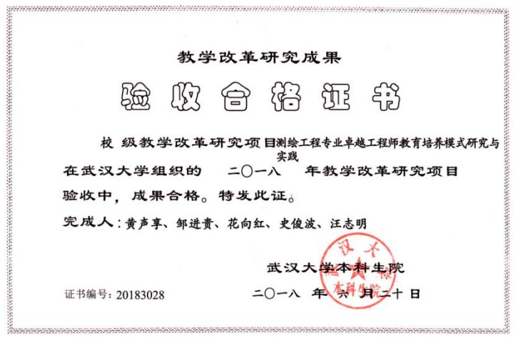 | 40. | 测绘工程专业卓越工程师教育培养模式研究与实践 | 黄声享 邹进贵 花向红 史俊波 汪志明 |