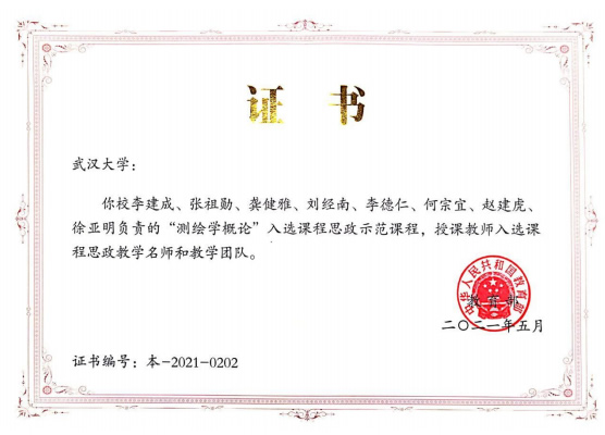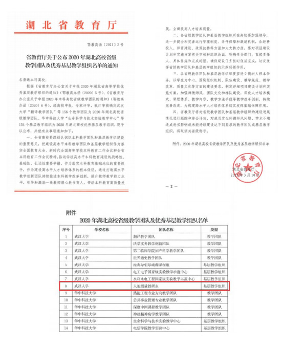 | 3. | 大地测量教研室 | 郭际明 史俊波等 | 湖北省高校优秀基层教学组织 | 2020 |