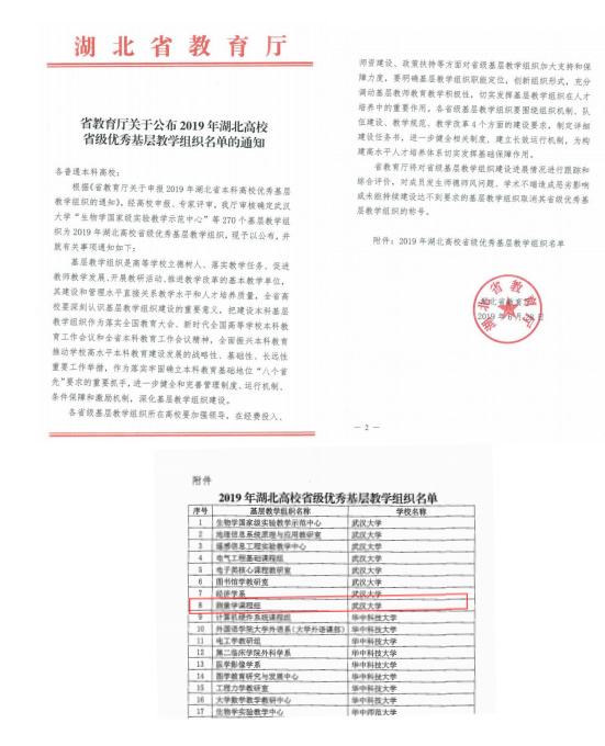 | 4. | 测量学课程组 | 花向红 邹进贵等 | 湖北省高校优秀基层教学组织 | 2019 |