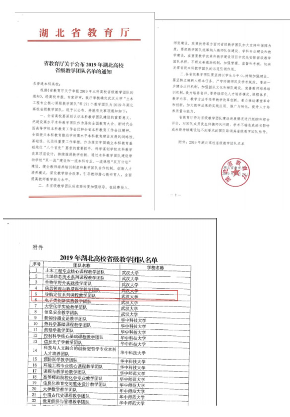 | 5. | 导航定位系列课程教学团队 | 张小红 黄劲松等 | 湖北高校省级教学团队 | 2019 |